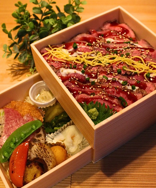 驚きのローストビーフが、お弁当の主役として登場します。柔らかくジューシーな肉質が、味覚を魅了します。そして、季節折々の恵みを詰め込んだ炊き込みご飯との相性は絶妙。松茸やカニといった、季節の味覚がご飯に香り立ちます。一段折り、二段折りと、お好みに合わせてお召し上がりいただけます。